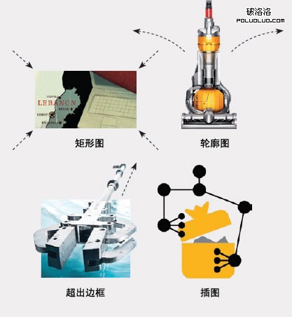 對圖片的剪切能夠傳達特定的含義——矩形圖片顯得正規低調,輪廓圖顯得開放自由,超出邊框的剪切傳達出動感,插圖傳達出象征意義及藝術感的視覺效果。