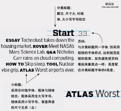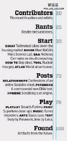 電視新聞報道中經常采用相關人物的原聲摘要講話來推進新聞,這其實是一種剪輯技術,它能夠使新聞報道無論是視覺上還是聲音上都顯得更簡潔。我們也可以將目錄看作是一種“原聲摘要”,在目錄中引用雜志所用到的材料傳達出一本雜志的聲音。在狹小的空間中,我們可以通過字體、圖片、顏色及其它元素構成文章的標題或目錄,將雜志中的內容在你第一頁時就盡可能呈現。