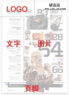 頁面分成兩個主要區域——左是文字區域,右是圖片區域,然後還有兩個小區域,一個是在上面放置標志的區域,而底部是一個強有力的頁腳。