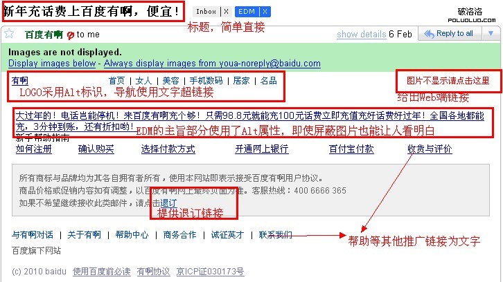 >>對於頁面內容:因為使用圖片無可避免,但是,重要的內容請務必使用文字,哪怕是使用了圖片也務必給出文字標識!這點上有啊的EDM做的很棒,有啊的EDM頁頭是LOGO+主導航的模式,LOGO使用了Alt屬性,同時主導航是直接實用的文字鏈接的形式。這樣就算整個郵件圖片被屏蔽了重要的信息還是可以顯示出來。