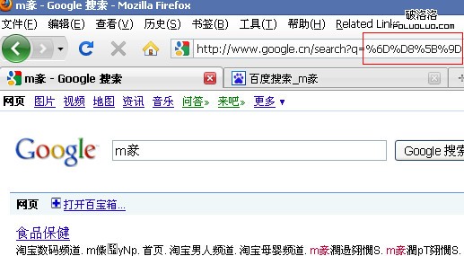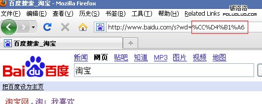 “淘寶”的unicode編碼為“%6D%D8%5B%9D”,在ff中訪問“http://www.baidu.com/s?wd=%6D%D8%5B%9D”