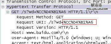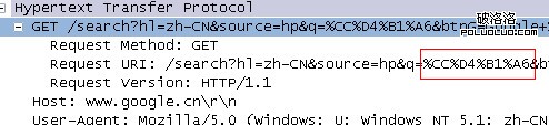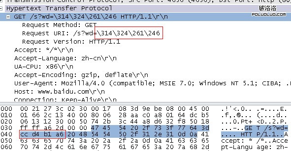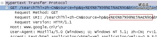 這裡可以看到,ie發起的http請求甚至沒有經過任何編碼,硬生生的將“淘寶”當作原始gbk字符,這樣,其他語言編碼的操作系統就無法識別這個url,這裡的“\314\324\261\246”是一種我也不知道是什麼東西的編碼,甚至連wireshark都不知道,因為“http://www.baidu.com/s?wd=\314\324\261\246”明顯是一個錯誤的請求。