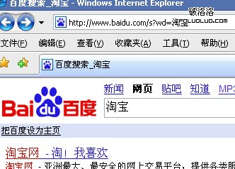 再來看IE中的情況,在ie中在百度和google中通過form搜索“淘寶”結果和ff中一致,但直接在地址欄中輸入中文url就有些奇怪了,在ie中訪問“http://www.baidu.com/s?wd=淘寶”,得到,