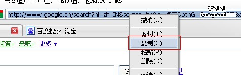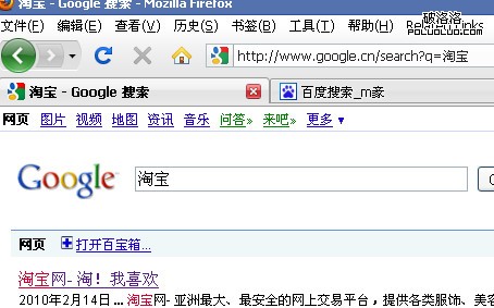同地址欄中顯示是一致的,搜索結果也正確。在地址欄中直接輸入“http://www.baidu.com/s?wd=淘寶”也是如此,在firefox中google“淘寶”:
