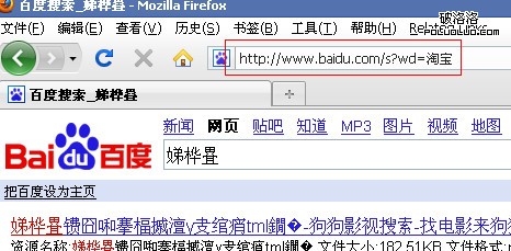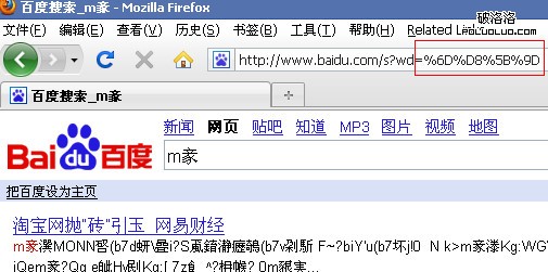 搜索到亂碼。“淘寶”的utf-8編碼為(所謂正宗的“URL”編碼)“%E6%B7%98%E5%AE%9D”,在ff中訪問“http://www.baidu.com/s?wd=%E6%B7%98%E5%AE%9D”,得到,