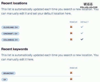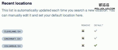 Nearby Tweets也不是總能找到用戶的位置,所以有時也需要手動覆蓋掉默認地區。我想過很多方法解決這個問題,比如增加個“set to default”的選項在每個已保存地區旁邊,但這可能會多出來很多鏈接,讓界面變得冗余。