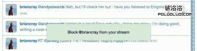 然而,用戶還有其他需求,他們要求可以關注某人、屏蔽某人,甚至屏蔽地區。像這種高級功能就不能塞滿tweet區域。Progressive disclosure的思想派上用場了。當用戶把鼠標移動到每條tweet上時,上述3個功能才顯示出來。就像這樣: