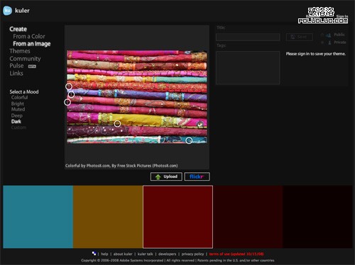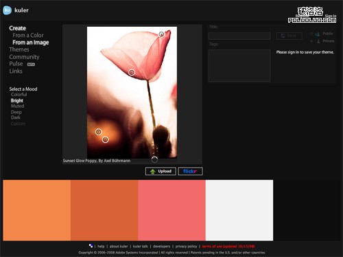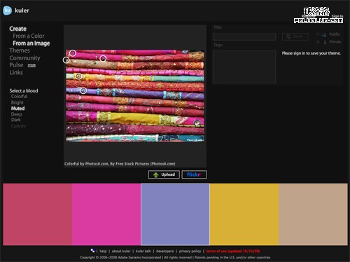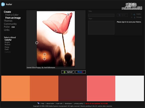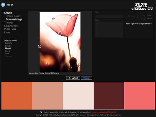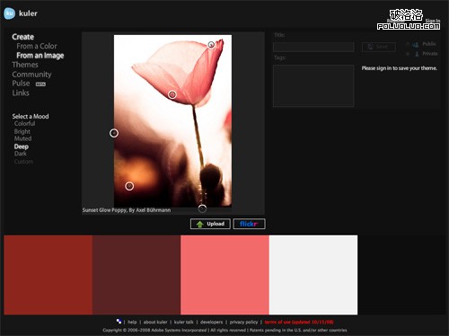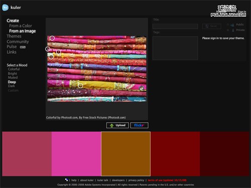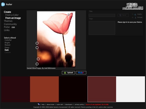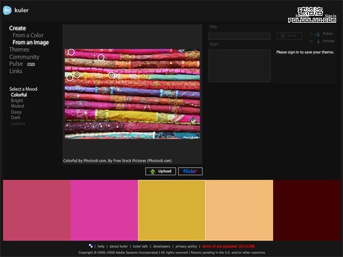 使用Adobe Kuler,不僅可以搜索Flickr上的照片,也可以上傳自己本機上的圖片。如果你正在為在網站設計中使用什麼顏色而絞盡腦汁的話,可以嘗試在Flickr中搜索相關的詞。有時,這種方法可以找到也許你自己都根本沒有想到的配色方案。