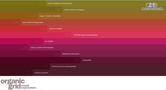 Organic Grid have taken a similar approach to 65 Media (vica versa), a simple vertical menu with a gradient of backgrounds. With some beautiful sounds complimenting the mouse over and beautiful transitions throughout the website, it is a joy to browse.