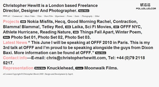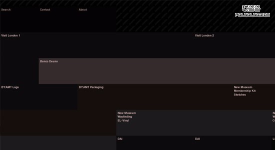 Josh takes a different approach to typical web design. Based around a grid, the main homepage is made up entirely of navigation withe each menu item taking up a different amount of blocks. Not sure what determines how many blocks an item takes up but nonetheless a very creative design.