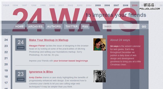 Athough 24 ways is comprised of just horizontal and vertical menus, it is the way they have been made that demonstrates creativity. With full height and translucent backgrounds the end result is very appealing.
