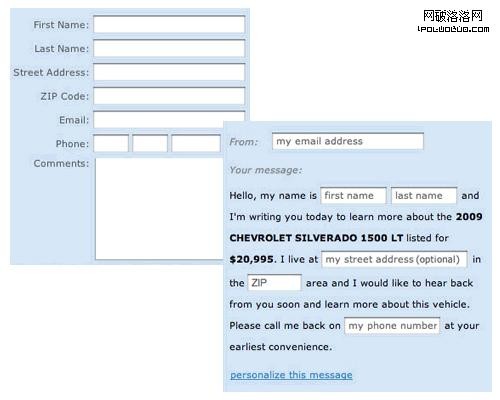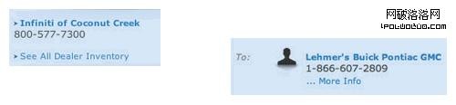 雖然可能這個人形圖標看起來不顯眼,但是讓人不經意間感受到似乎是在與一個人交互。注意兩幅圖裡經銷商的名字不一樣,電話也不同。這是實驗的設計,在不同的經銷商的頁面使用不同的界面,以方便比較。