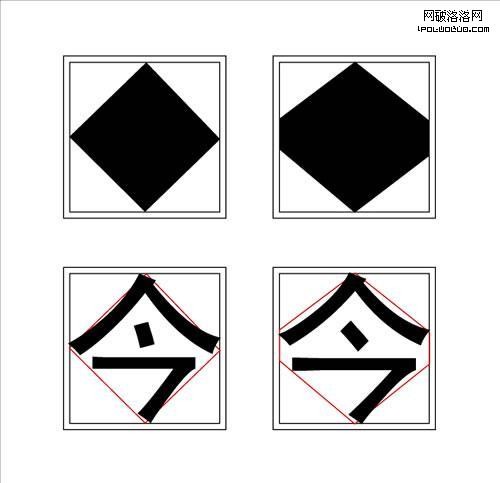 要想做大字面的字,我們首先要考慮面積最小的菱形,那麼,怎樣才能把菱形字做大?很簡單,只要適當調整改變菱形的形狀,那麼,我們就能得到比原來菱形面積大的形變圖形,用這種方法來設計,就可以得到在視覺上比原先字面大的字。