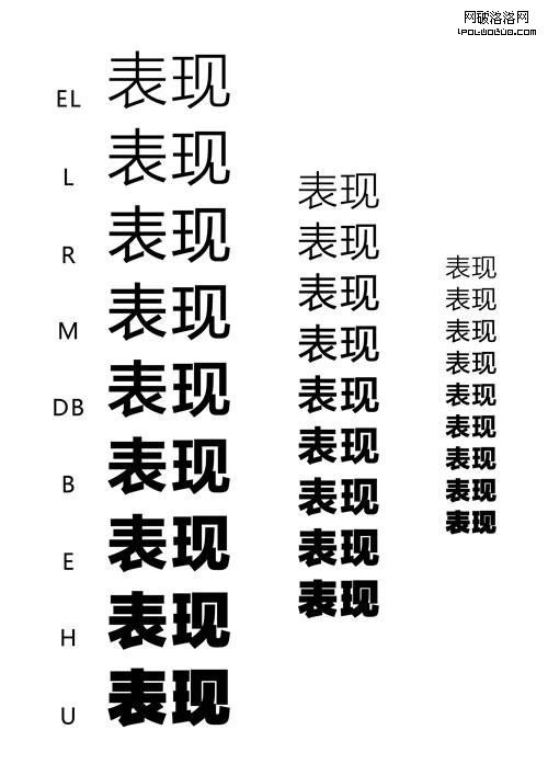 下面通過調整統一字體的粗細,來了解筆劃粗細與結構、留白、重心之間的關系。為了更好的說明問題,便於理解,選用多筆劃和少筆劃的粗體字為例。