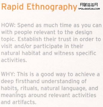 網頁制作poluoluo文章簡介:近期有機會展開實地調研,嘗試將ethnography(人種志)方法用起來,但我遠不敢稱此類研究就是人種志研究了,最多能算是以下這張IDEO方法卡所謂的敏捷人種志研究。