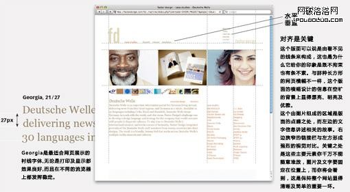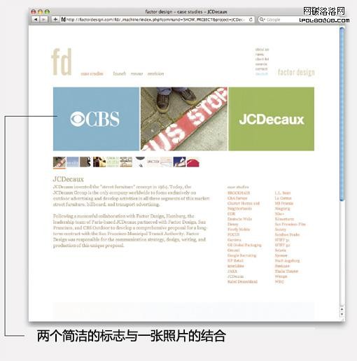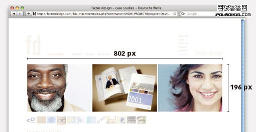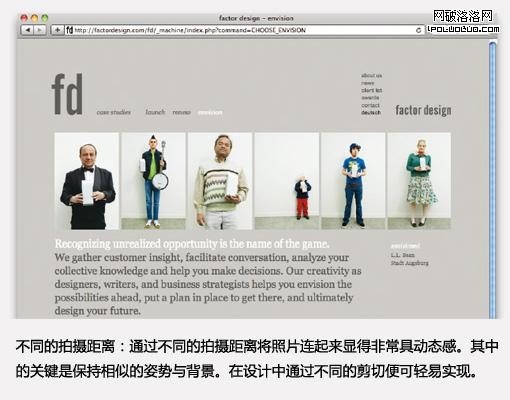 這個版式結構我們有兩點是特別欣賞的:一是它采用了印刷類的平面設計風格,使用襯線字體,文字顏色對比低調柔和,不同文字欄寬度形成強烈對比。二是上面的水平圖片區域設計,使整個版面顯得優雅漂亮。這個圖片區域只看上一眼,你可能不能一下子認識它的所有優點,但我們之所以深入討論這個區域是因為如果從技術上來說,你采用了同樣這種方法,就可以得到同樣漂亮的相似效果——無論是網站設計還是其它平面設計。看一下我們能夠從這個網站設計中學到什麼。
