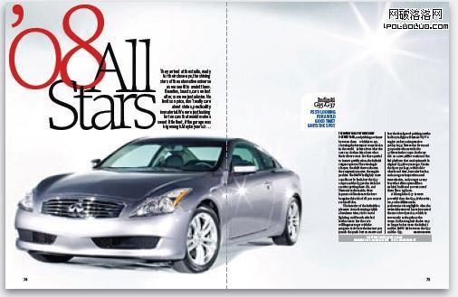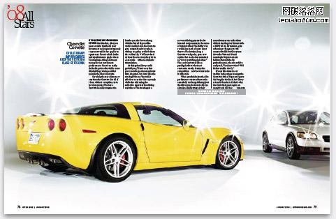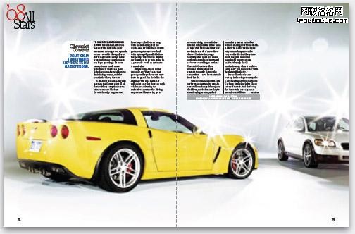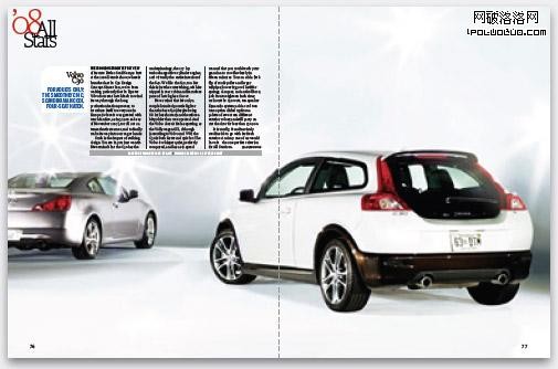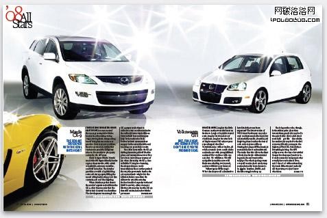 雜志其中一個最大的特點是其具有順序的特點,呈現一種線性的連貫:首先是這個,然後去到下一個,再去到下一個。這種特點符合我們的閱讀天性,也使我們能夠更好地明白相關的信息。但如果你要讓所有的東西能夠一次性展示,你如何做到?比如,我們有10輛汽車要展示。一般情況下,我們看到的,都是支離破碎的信息,每一頁展示其中一個,這樣連續性的視覺效果就會被破壞。在2008年1月出版的《名車雜志》 “全明星”(All Stars)專題中,它們采用了一種聰明的辦法來進行排版。在排版中,每一個展開頁都展現一輛汽車,但同時又能遠距離觀察到前一輛車。這種效果就象我們走進一個汽車的陳列室,我們一邊走,一邊打量起某一輛車,但我們仍然可以看到旁邊的車。讓我們翻開雜志瞧瞧: