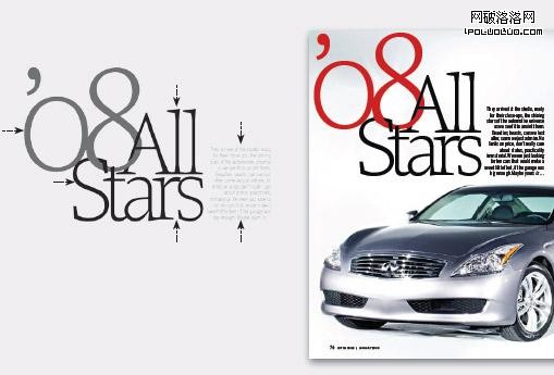 文字塊在每一頁都重復應用,使到雜志中的文字信息不斷延續下去。那個藝術化的“08 ALL STARS”標題是這個專題中一個重要的標識: