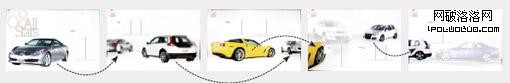 不斷引導:為了模仿真實的現場感,沒有一個展開頁中的汽車是完全相似擺放的,出來的效果就是引導你不斷繼續看下去。我們截取幾個展開頁放在一起你就能夠完全看得明白。上述的汽車既是這一頁的主角,但同時又是下一頁的配角。非常有趣的排版,完全值得將它記在筆記本上慢慢學習。