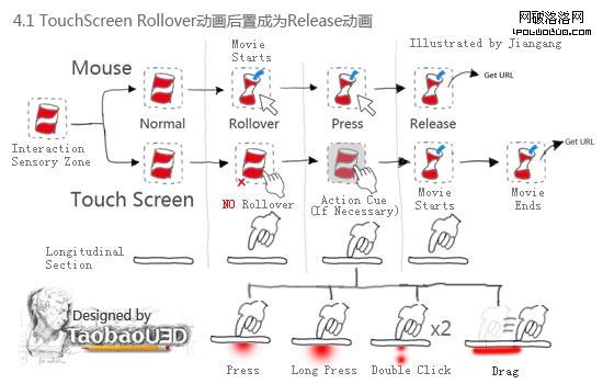 使用觸摸屏時,手指放在感應區上方懸停,並不能觸發交互動作,因此絕大部分情況下,是沒有Rollover狀態的(觸摸屏加上WII技術又另當別論)。所以,響應用戶點擊行為的提示動畫會在手指按下(Press)並且脫離接觸(Release)的那一瞬間才開始。(注意是Release時才開始,如果在Press時動畫就開始播放,手指就會把動畫部分擋住。) 另外,比較高級的觸摸屏終端支持指尖長按(Long Press)、拖曳(Drag)等行為,設計時可以作為交互動作的補充。