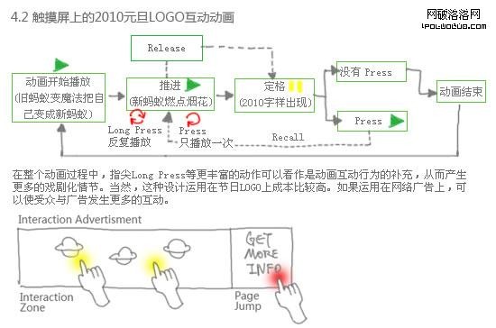 從圖例可以看到,觸摸屏的FLASH LOGO動畫設計與普通的設計差別並不大,除了Rollover動作改成Press(Actually: Release)動作外,最大的區別可能在於當鼠標Rollover時,動畫可以不斷反復播放,而換成觸摸屏時,手指Press一下只能Recall一次,要Long Press才能不斷重復Recall的情節。在整個設計過程中,指尖Long Press, Double Click甚至Drag可以產生更豐富的互動行為,從而引出更多的戲劇化情節和視覺效果。當然,這種設計運用在節日LOGO上成本比較高,(設計制作、用戶摸索和學習互動行為兩方面的成本)。如果運用在較大型的互動動畫或者網絡廣告上,則可以使受眾與廣告發生更多的互動、從而提高用戶的參與度、提升其品牌體驗。如果要讓消費者實現跳轉怎麼辦?用戶體驗設計良好的網絡廣告通常都會把跳轉的響應區域單獨劃分開來。