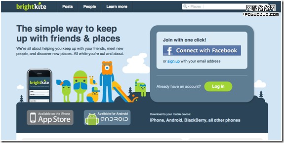 為實現效果,讓我們來看看Brightkite重新設計後的用戶體驗(圖三),“與朋友保持聯系”這句話放在了頁面正前方。體現在網站首頁上的主要功能從注冊新帳號變成了邀請用戶聯系他們在Facebook上的朋友。這種一鍵式流程拋棄了圖一所示的笨重注冊表單,給人們提供了已經存在的身份和朋友(來自Facebook)。