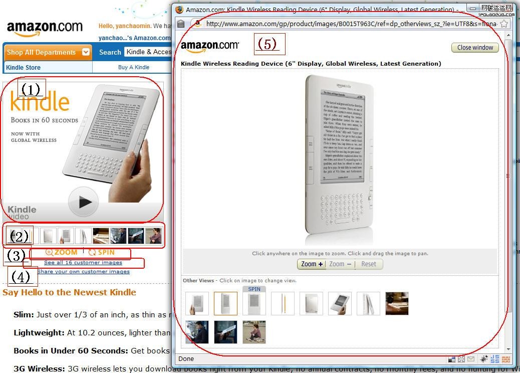 上圖是Amazon.com的產品詳細頁面,圖中標識了1 ~ 5 個數字,表示不同的部分。