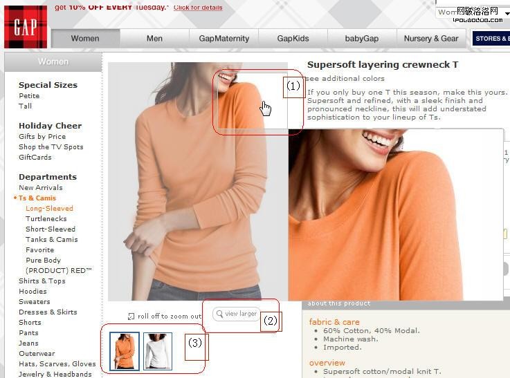 View Larger:查看大圖。點擊後彈出大圖,這也是一種常用的手法,但是Gap將多圖和顏色規格