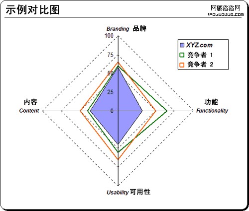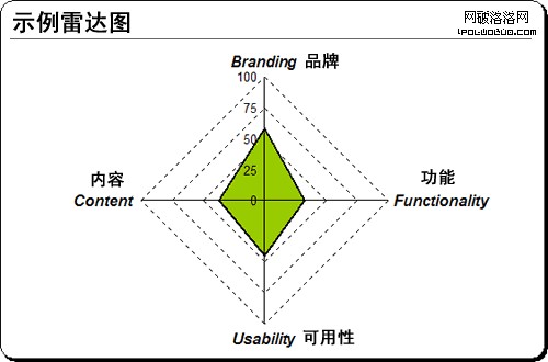 你當然可以在分析中添加第五個類別來描述易用性(友好度)或者商業指標。例如,你得到了一個政府客戶,需要嚴格遵循508規則(針對美國)。你可以容易地創建一套描述或參數來專門處理易用性(友好度)元素,修改你的圖表來相應展示。同樣,你也可以很容易地創建一個類別來專門處理你的客戶的重要商業指標,比如,ROI,點擊率,轉化量,或者重復顧客數。