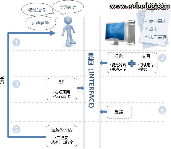 1-用戶的過往經驗、領域知識、學習能力,是其心智模型的基礎。系統則從商業需求、成本(可行性)、用戶需求出發,確定功能。二者通過人機交互界面溝通。