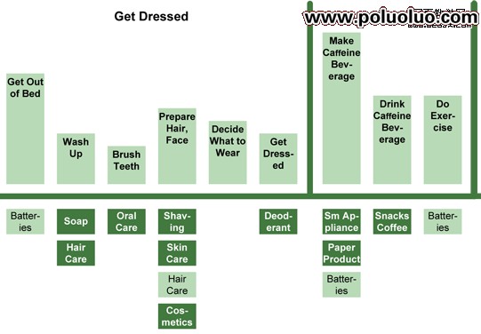 (2)心智模型行為親和圖:將人種志研究獲取的關於目標用戶的行為數據可視化的一種方式。如圖3所示,橫軸以上被縱軸分開的每部分(穿衣、起床等),是一個心智空間(mental space)。每個心智空間內又被切割成若干部分。橫軸以下,是對應每一心智模塊的產品或產品功能。通過對比可從中發現你的產品/產品功能在哪些方面有所欠缺。