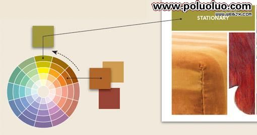 在這個例子中,椅子上的所有顏色幾乎都是暧色調,為了使整個設計具有暧色調的感覺,我們可以采用一種相近色來作為搭配。兩種相近色具有同一種基色,具體在這個例子中,我們從上圖的色輪可以看出,棕色與草綠色都包含了黃色這種基色。這種擁有同一種基色的顏色總是能夠形成良好搭配效果。