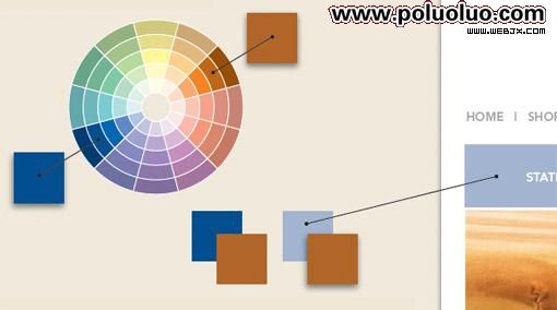 如果你不希望整個版面有太多的暧色,那我們可以采用補色(即在色輪中相對的顏色或相隔 180 度的顏色)搭配。