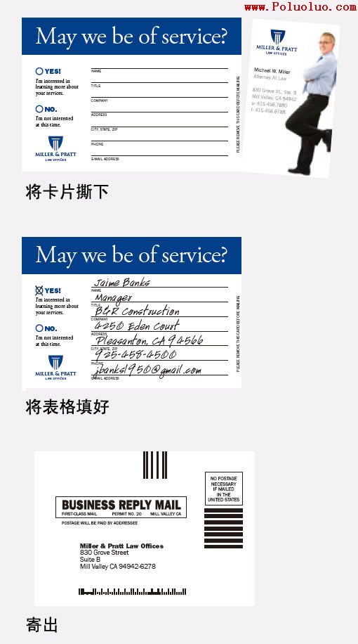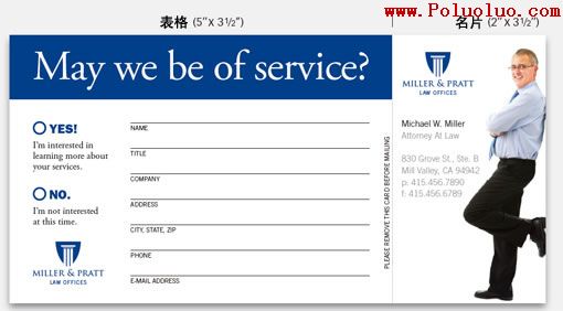 (注:上面的律師事務所宣傳卡片中,左為由收件人填寫的表格,右為律師聯系名片。左方的表格區域是讓有興趣的目標顧客填上自己的聯系信息寄回律師事務所)