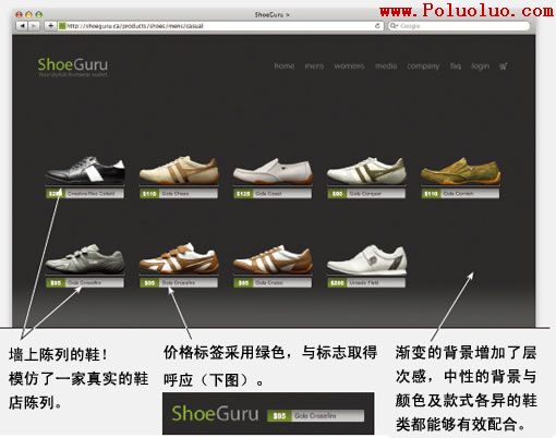 ShoeGuru的網上鞋店給人的感覺是如此的真實,你幾乎都可以聞到皮革的味道!簡潔、在牆上陳列的設計給人一種非常真實的體驗,對於一個銷售鞋類產品的網站,簡直就是完美的設計。