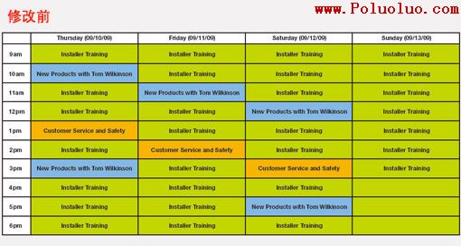 這張表格,信息不可謂不全,但裡面有很多計劃事項都是在不斷重復,而且顯得很厚重。三個信息(日期、時間及項目)看起來很相似。雖然上面表格的顏色搭配不錯,但一句話:壓得人喘不過氣來。根本不留一點透氣的空間給觀看的人,而其中的“設計”元素,就是那種矩形色塊,由軟件默認產生,而沒有經過細致雕刻。