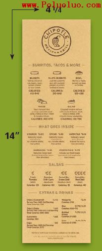 吸引人的版式使信息傳達更有效果:瘦長形的菜單由下至下一覽無遺地方便顧客觀看,這個尺寸剛好是一張標准紙張14×8.5(英寸)的一半。