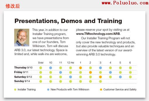 同樣的信息,但看起來完全不一樣!我們保留了原表格中的顏色,但是由小圓點放在白色背景上構成,顯得清新悅目。相關項目不象原表中反反復復地呈現,在這裡,我們只在表格下方呈現一次。對於文字,不同的信息由大小不同的文字構成。與舊表格對比,高低立判。而且它只占用原來一半的版面,多出來的寶貴空間,你盡可以放上一些你希望傳達的信息。