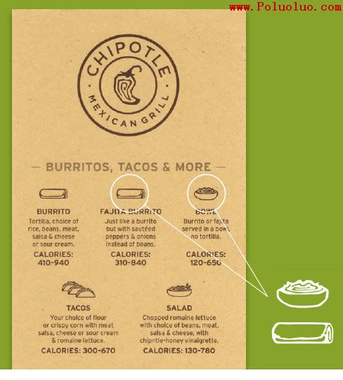 Chipotle是一家經營墨西哥玉米卷及豆卷烤肉的小店鋪,它知道你並不需要什麼格調高尚虛張聲勢的精美菜單。我們所設計的這個菜單,只采用一種顏色,再加上一些想象力,便大功告成。