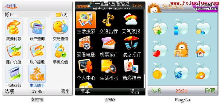 當多個功能之間相對獨立,用戶根據需求選擇其中一個功能時,按鈕式布局是一個不錯的選擇,結構清晰、簡單明了。支付寶、12580客戶端、PingCo等手機產品的初始界面都采用了典型的按鈕式布局方式。