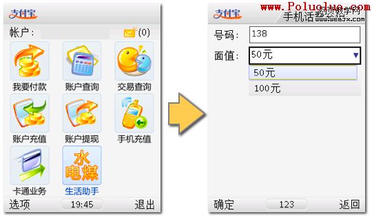 以支付寶為例,當在多個按鈕中選擇某個功能按鈕後,如“手機充值”,則直接進入手機話費充值頁面,然後進行相應的手機充值操作。這種設計結構清晰,手機支付寶有8個主要功能,分成8個按鈕,布局有條不紊。