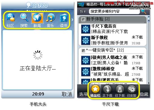變體。標簽式布局也可以有更多的表現形式,下面便是兩個例子。在手機大頭中,幾個主要頻道全部通過標簽進行組織(雖然看上去很像大大的按鈕),頻道之間通過左右鍵就可以實現切換,當前選中標簽一直處在中間位置,非常明顯。在千尺下載中,幾個主要功能的標簽被放置在屏幕底部,和手機大頭一樣,也是通過左右鍵實現標簽切換,當前標簽通過黃顏色識別,使用起來也非常直觀。