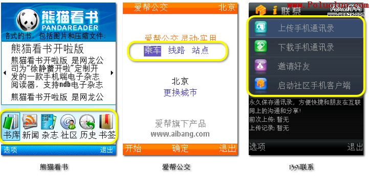 變體。按鈕式布局的表現形式多種多樣,有很多變體。比如,在熊貓看書中,幾個功能按鈕排成一行,放在底部,上面是熊貓看書的一些通告;在愛幫公交中,幾個鏈接本質上是就是按鈕,可以分別選擇乘車、線路或站點查詢;在139i聯系中,按鈕成為長條形,每行一個,排成一列(樣式上類似於iphone上的系統控件),每個按鈕被激活後,下部都會有對應功能的解釋。這些以不同方式展現出來的按鈕式布局,或者更加美觀,或者更加簡潔,把多個功能進行了有效的組織。