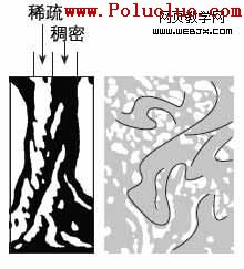 這棵樹有很豐富的紋理。其紋理給人一種凌亂感,但要特別留意其中所產生疏密不一的紋理形成了正空間(黑色區域)及負空間(白色區域),其象河流的紋理就象池塘中的鮮苔。