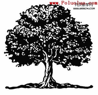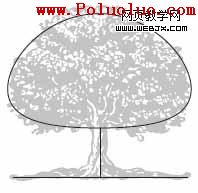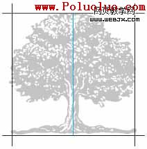 這棵樹給人的感覺是很濃密粗壯的,這一特性對我們在余下的設計是具有很大的影響力的,而我們在看一件東西的比例時,有時會給自己的眼睛所欺騙,所以最好的辦法就是直接在圖片上畫一個方框來觀察(如上圖),不要輕易相信自己眼睛所看到的。加了一個方框後,我們看到這棵樹的幾個比例特點: