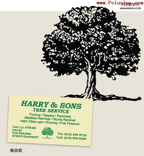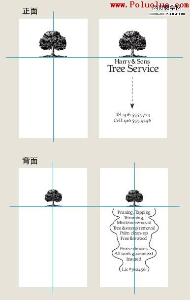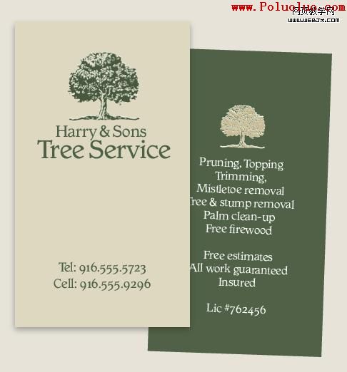每一個元素的安排都根據樹林的特點來安排。卡片是垂直擺放的,文字從上到下,就象樹桿給人的感覺一樣,首先安排 LOGO ,底部是電話號碼,中間大片留空的區域讓眼睛有放置的地方。而在背面版式中,相同的樹木元素再次出現,但尺寸卻較小,而且留意一點,在背面中, LOGO 下方並沒有名稱,這樣使人不會搞不清哪一面才是正面。多行文字既容易閱讀,也模仿了樹木的輪廓。這個時候,無論是樹木、字體、版式及顏色,都呈現了一致的視覺效果: