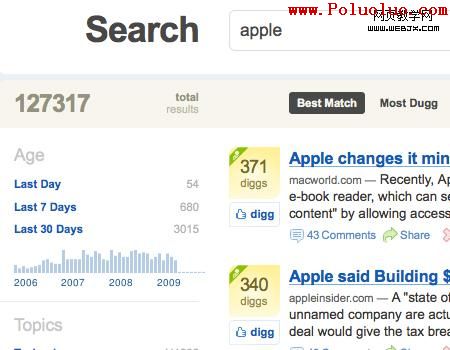 搜索結果頁面比一個友好的搜索輸入框設計顯得更為重要。Digg最近更新了他們的搜索引擎,現在是一個非常實用和友好的搜索例子。您可以通過一些選項來組織搜索結果,這些選項如最佳匹配,Most Diggs,以及最新的。在左邊你會發現時間范圍列表,Digg范圍,熱門話題和熱門分類。此外,您還可以按內容的來源來組織搜索結果。在搜索結果頁的頂部還有一個巨大的搜索框,方便用戶搜索其他關鍵字。