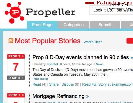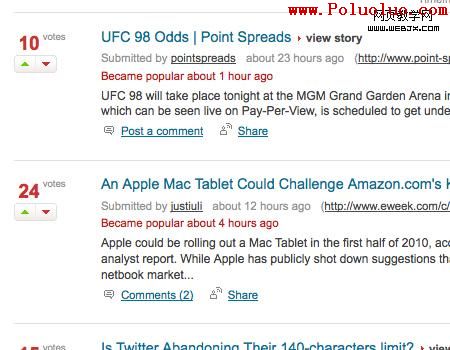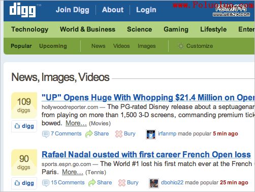 關於這個概念的例子,看下Digg的用戶界面(見下圖)。當你浏覽digg的時候,你會發現文本內容以一種非常一致的方式,在字體大小、字體顏色和其他元素間有著各種不同的變化。還要注意這種設計是如何有效地為用戶提供一個清晰的導航路徑的;主要的鏈接以下劃線和藍色予以突出,而“更多...”鏈接是灰色的,其他鏈接沒有下劃線,另外的一些文字內容是則是紅色或者是灰色的。