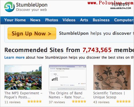 StumbleUpon采用的基於網格的結構,其中的每個內容項目有著相同的高度和寬度。這是另外一種有效的溫和的分隔方式。