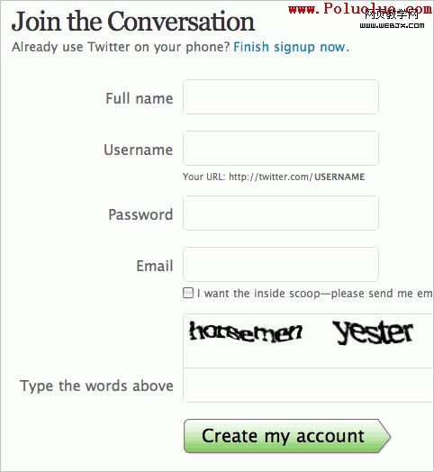 Twitter的注冊表單也很干淨整潔,且不要求密碼確認。一旦光標移到輸入框中,右邊就會顯示提示信息。